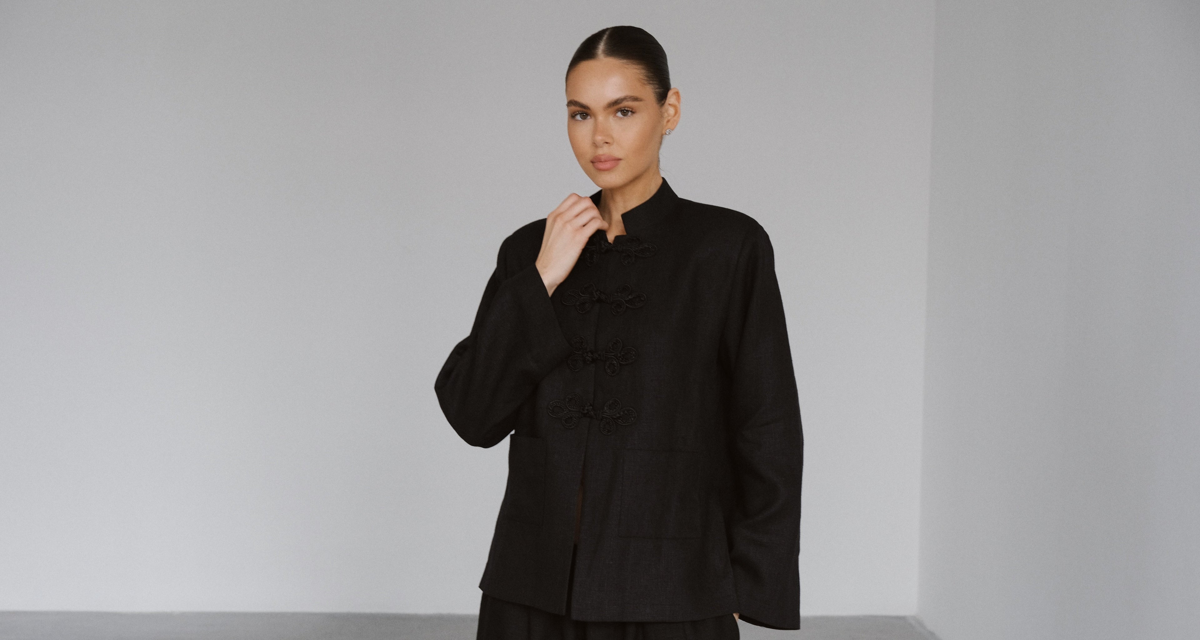 Graphite Wool Coat with Stand Collar – Wabi-Sabi Elegance | CHELIE