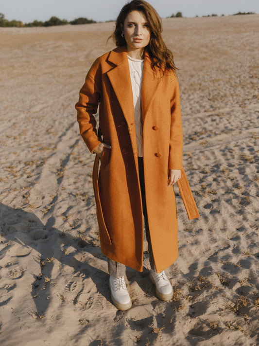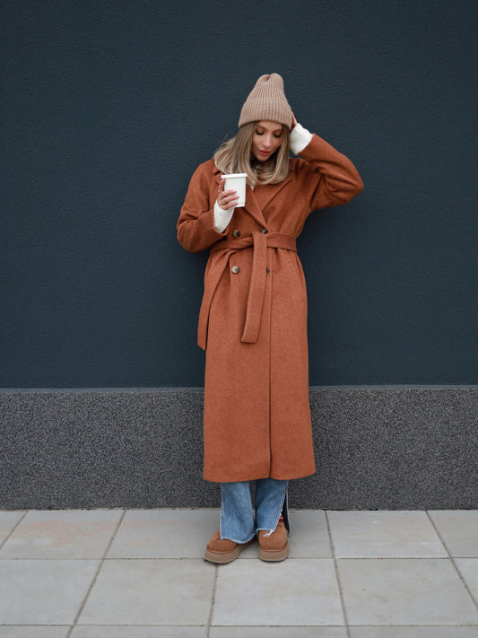 Rusty Red Double-Breasted Wool Coat with Belt