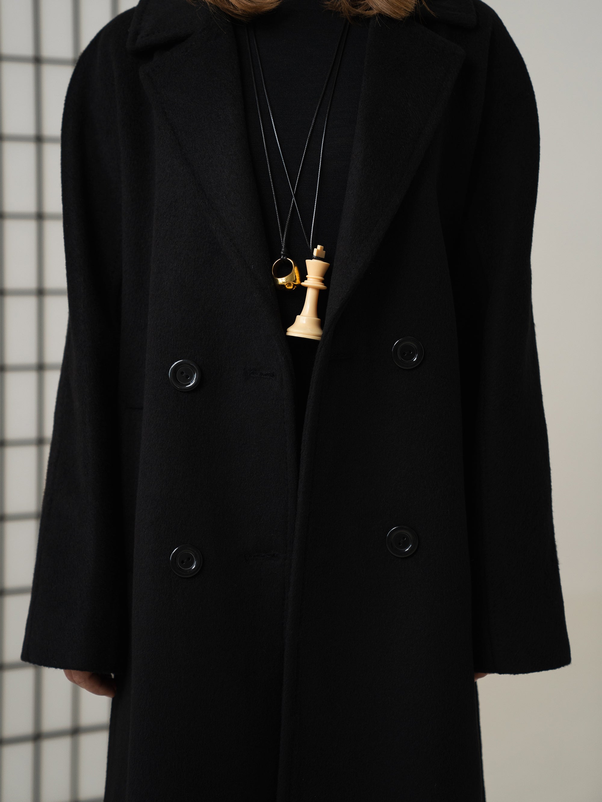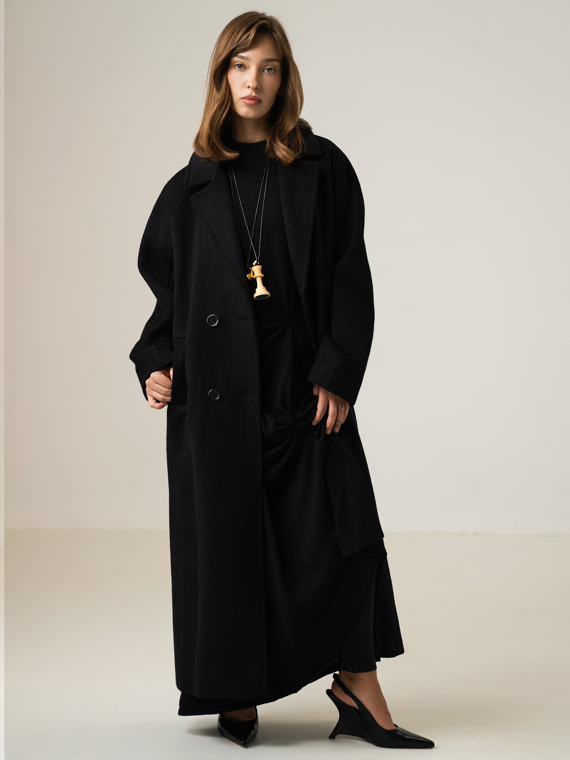 The matching black long wool coat with belt cinches at the waist, creating a flattering, feminine silhouette. With a length of 130 cm, it’s the perfect choice for layering over your favorite outfits.