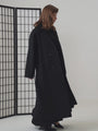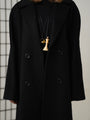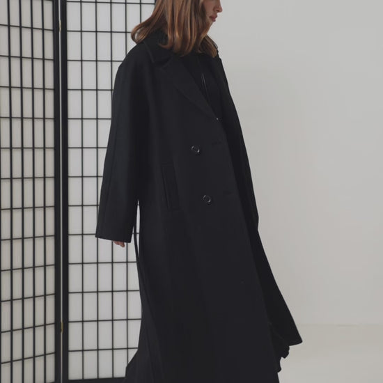 Chelie's black long wool coat with belt, an essential for women seeking elegance. Crafted from a premium blend of 90% wool and 10% Polyamide.The topcoat features a flared silhouette, a double - breasted collar, welt pockets, combining modern and functionality.