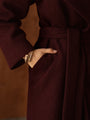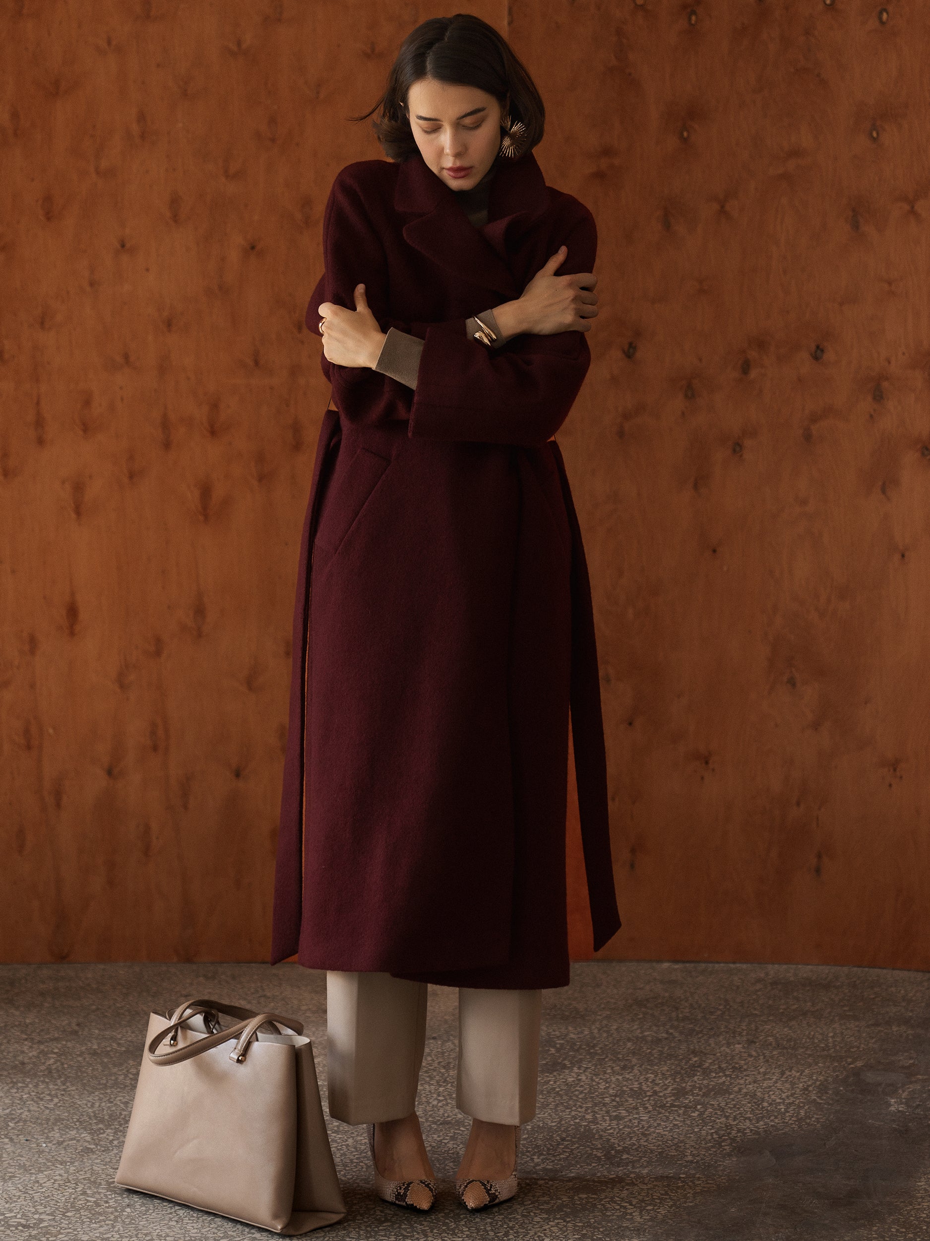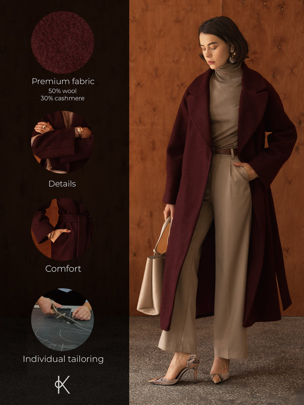 Elevate your wardrobe with our women’s long burgundy coat, a hand-stitched masterpiece crafted from high-quality fabric with wool. This stylish wool burgundy coat features lapels, slit pockets, and long sleeves, enhanced with an external trim tape for a refined look. The matching belt allows you to accentuate your waist, making this topcoat both elegant and flattering.